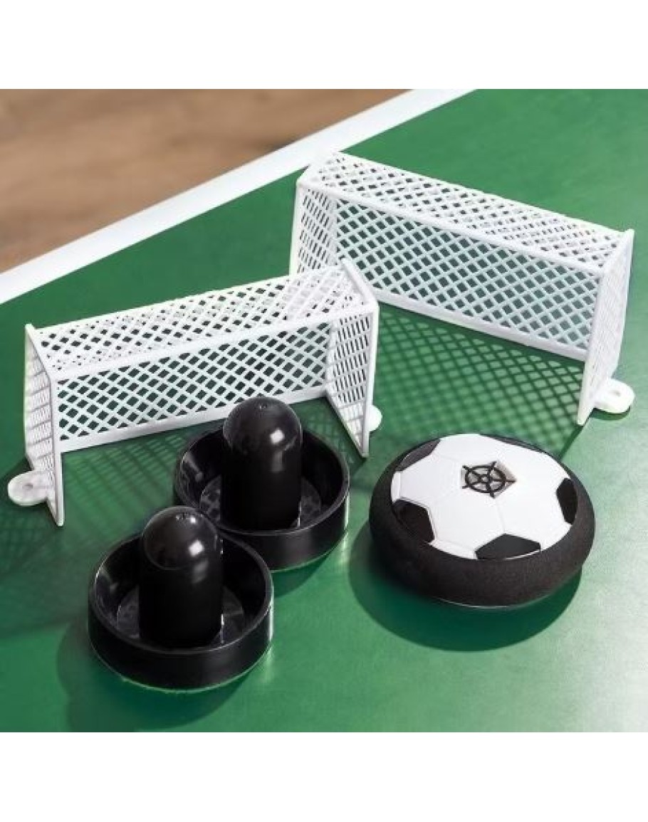 Met de Tabletop Air Football-set voetbal spel voor binnen kun je elke gladde tafel als speelveld gebruiken, met behulp van een puck die over een luchtbed glijdt, twee gedempte spitsen en elke speler een zuignapdoel.