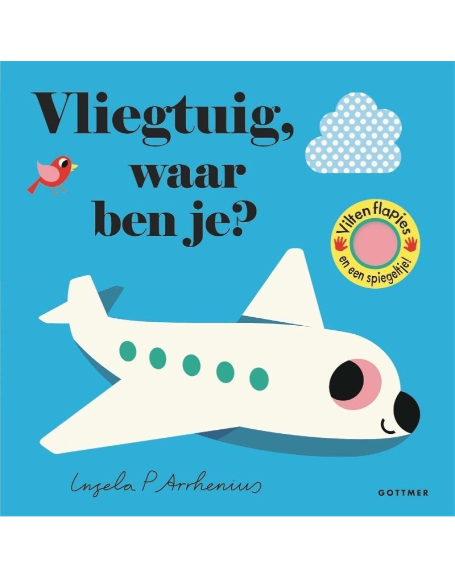 In het kartonnen peuterboekje 'Vliegtuig, waar ben je?' kunnen kindjes op zoek naar een helikopter, een raket en een stoer vliegtuig. En onder de laatste flap? Verrassing! Daar zit een spiegeltje: kindje, waar ben je?