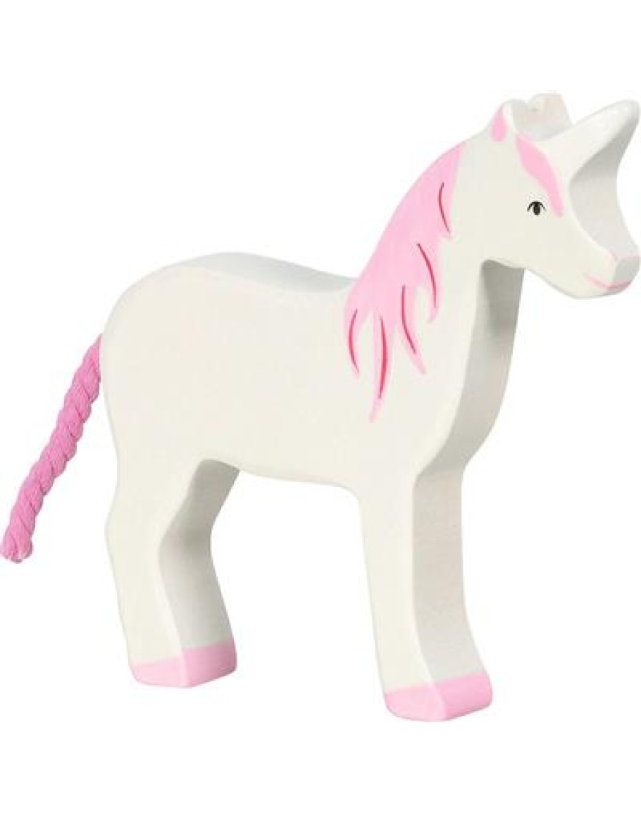 Prachtige eenhoorn van Holztiger. Deze dieren worden met de hand gemaakt van duurzaam esdoornhout en daarna geschilderd en afgelakt met een verf op waterbasis. Met deze mooie houten dieren kunnen kinderen hun fantasie de vrije loop laten. Ze staan ook nog eens heel mooi op een kast of plank in de kinderkamer. Maat: 12,5 x 2,8 x 14 cm.