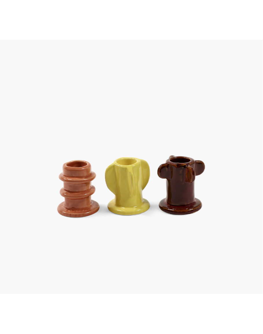 A playful set of ceramic candle holders from the Molly collection, designed by Marie Michielssen. Each piece features a distinct shape and a colorful glazed finish. Together, they form a vibrant trio of candle holders that bring character and creativity to any interior.
