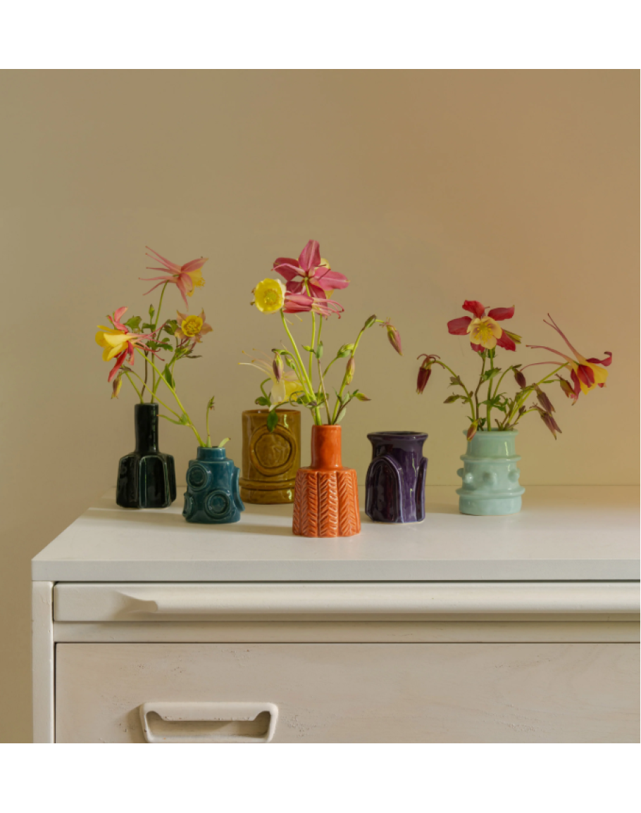 A playful set of six ceramic vases from the Molly collection by Marie Michielssen. Each small vase has its own shape, glaze and detailing, from textured finishes to playful forms. Together, they create a lively decorative landscape for single stems or as expressive accents on their own.