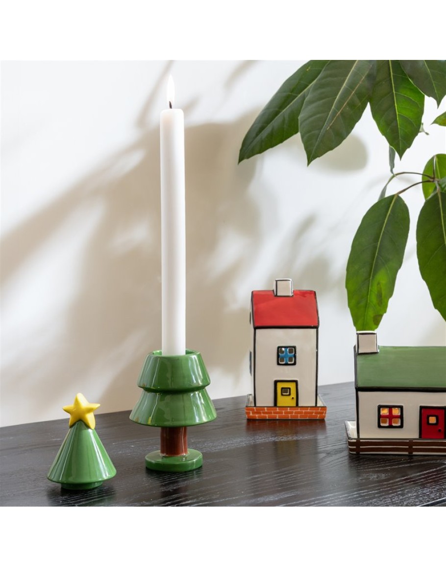 In collaboration with English ceramicist and illustrator Hal Haines, these tree-shaped candle holders bring a playful forest vibe to your home. Crafted from ceramic and hand-painted in vibrant colors, they showcase Haines’ distinctive blend of storytelling and design. Mix & match with Hal Haines’ tealight houses to create your own cheerful miniature village full of light and color. Designed to hold both dinner candles and tealights, they add charm to any setting, from festive tables to cozy corners. Carefully packed in &klevering’s special edition box featuring Haines’ artwork.