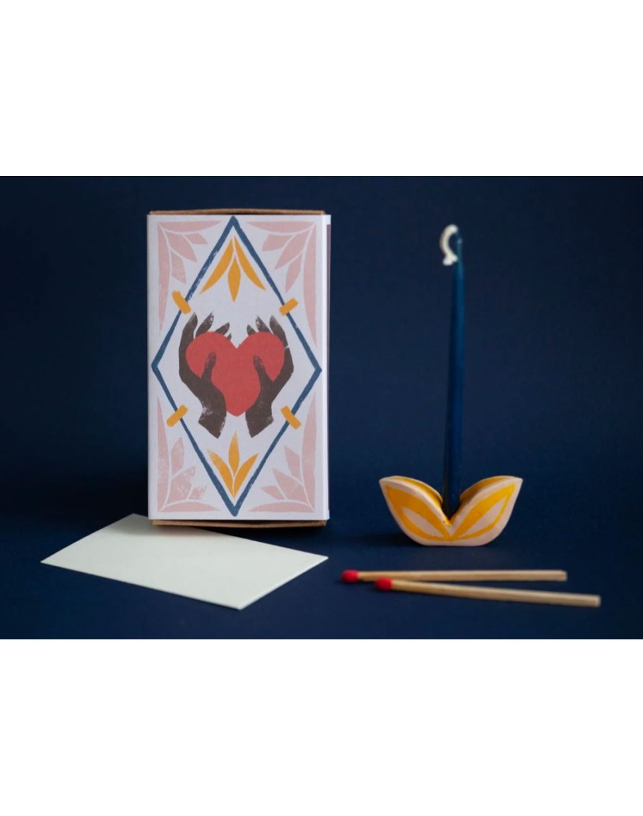 Verstuur een kaarsje in een doosje met een kaarsenhoudertje, 2 lucifers en een kaartje.