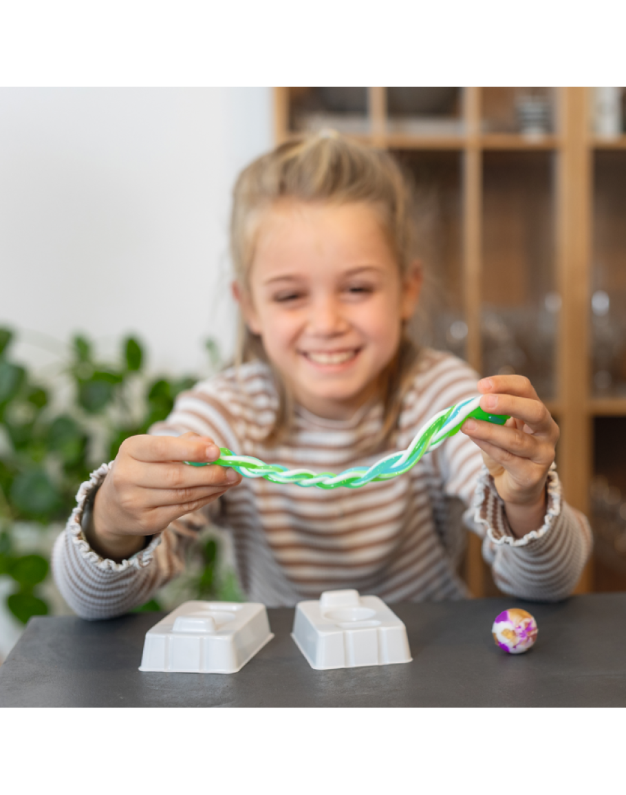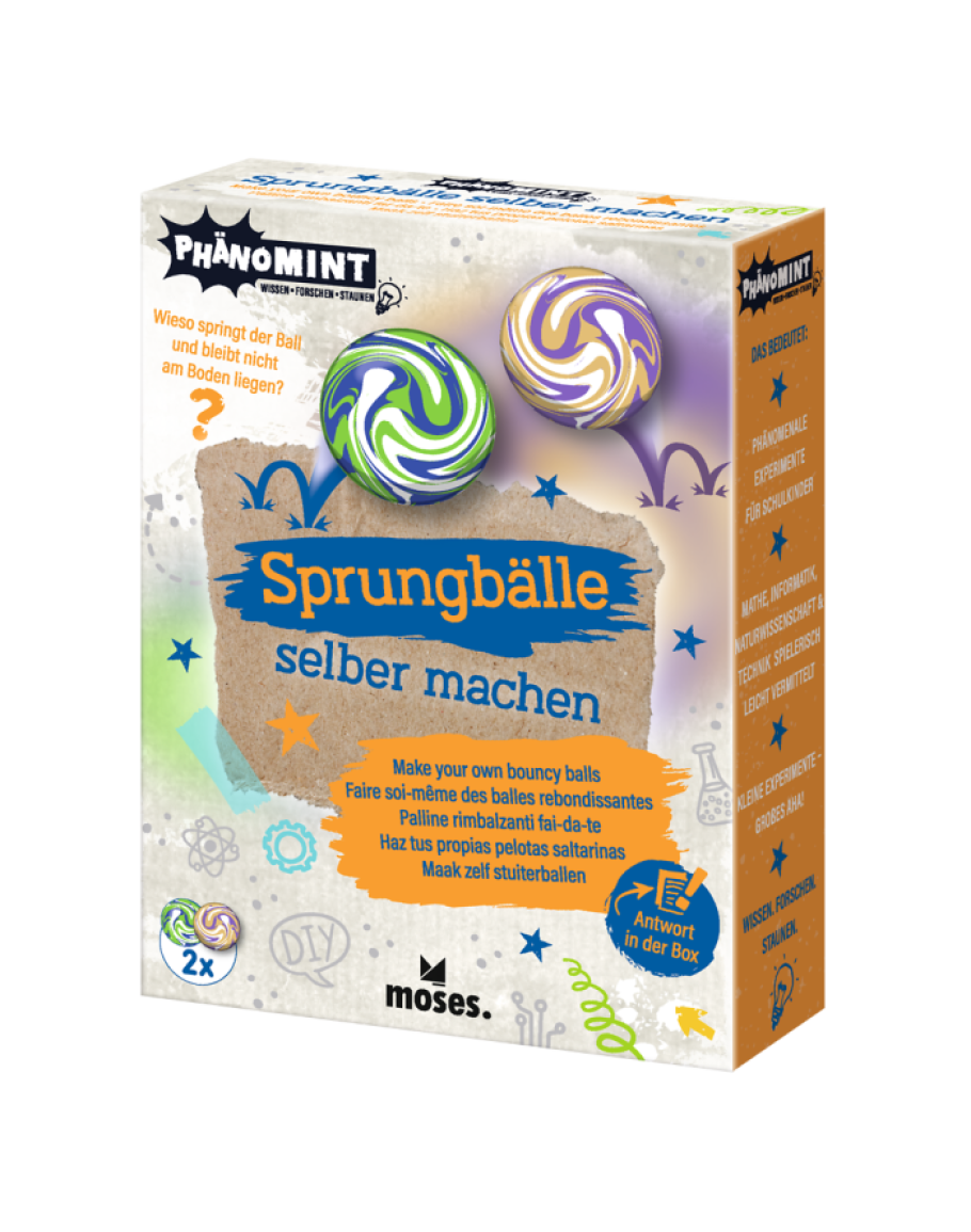 Meng de kleuren, vorm een bal, laat 20 minuten drogen en springen maar! Inclusief fascinerende informatie over de fysieke principes van een spring. Afmeting bo: 11 x 15 x 3. cm. Genoeg voor het maken van 2 stuiterballen van circa 3 cm. De geweldige nieuwe serie PhänoMINT bevat kleine experimenten op het gebied van techniek, wiskunde, natuurkunde en informatica die eenvoudig te doen zijn maar een groots resultaat hebben. De experimenten zijn geschikt voor kinderen tussen de 6 en 12 jaar. Een boekje met uitgebreide uitleg in 5 talen is bijgesloten.