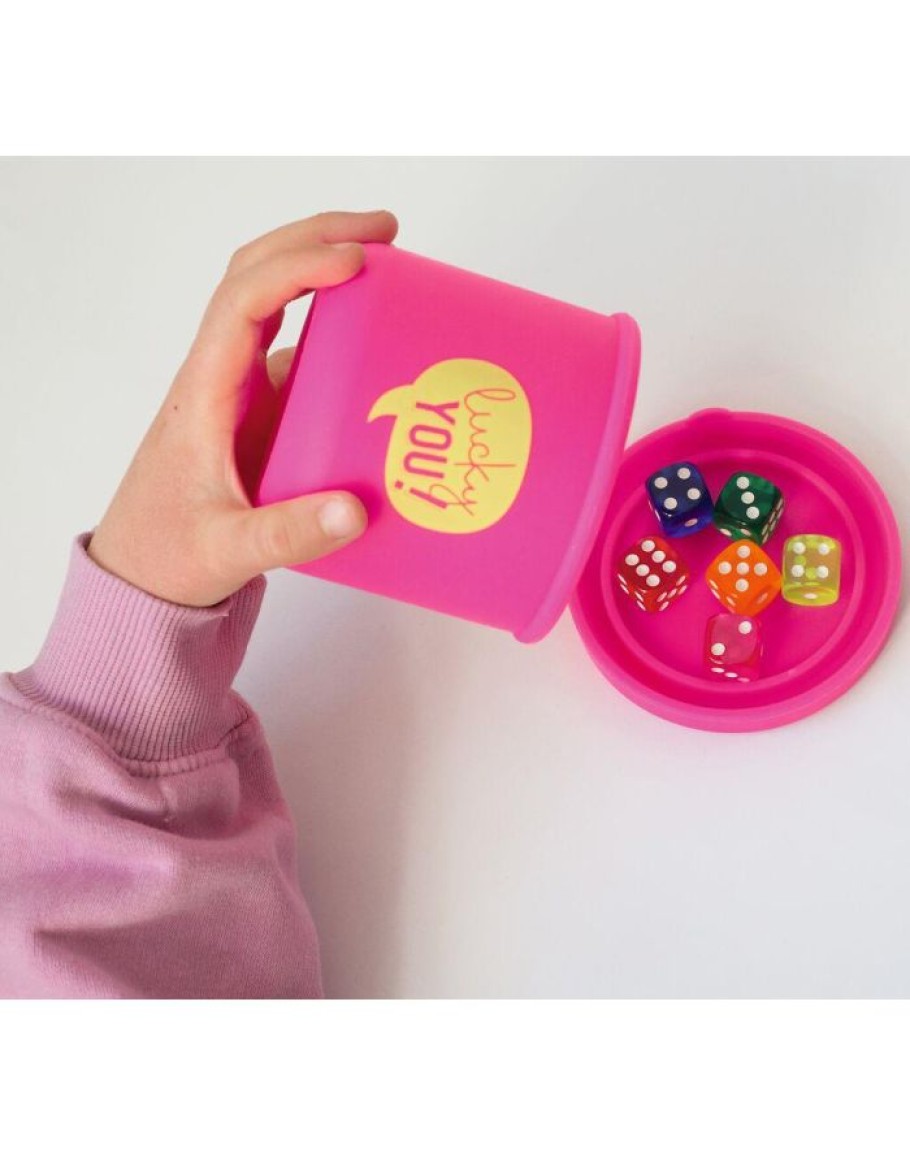 Dobbelsteen beker gevuld met 6 gekleurde dobbelstenen, beker is gemaakt van siliconen, inclusief 3 dobbelsteen spelideeën. Afmeting: 8 x 9.2 cm.