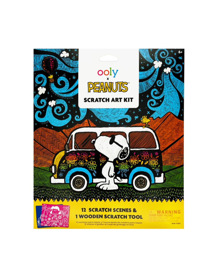 Ontdek Snoopy’s avonturen in levendige kleuren met de OOLY x Peanuts Kraskunstset! Kras over het oppervlak en ontdek vrolijke Peanuts-taferelen met Snoopy, Woodstock en de bende. Deze kraskunst voor kinderen bevat 12 krasloten en een houten stylus, perfect voor kinderen die van verrassingen houden. Of je nu Snoopy in vlucht of Charlie Brown aan slag laat zien, deze set laat met elke kras de vreugde van de Peanuts-wereld zien! 12 krasloten in vrolijke kleuren (roze, blauw, zwart). Verpakkingsformaat: Hoogte 24 cm x Breedte 20 cm. Geschikt voor kinderen vanaf 6 jaar.